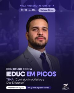 O Conselho Regional de Corretores de Imóveis do Piauí (CRECI-PI) irá promover, no dia 7 de agosto, uma aula do Instituto de Educação do Corretor de Imóveis (iEDUC) no município de Picos, no interior do Piauí. Com o tema “Contratos Imobiliários e Due Diligence”, a aula proporcionará aos corretores uma imersão sobre segurança jurídica em contratos imobiliários.