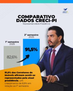 Os dados comparativos também apontam um crescimento significativo na percepção de representatividade da presidência do Creci-PI. No 1º semestre de 2025, o índice era de 82,6%, avançando para 91,5% no 2º semestre, um crescimento de 8,9 pontos percentuais. Atualmente, 91,5% dos corretores de imóveis afirmam sentir-se representados pela atual presidência.